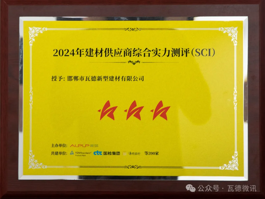 2024年4月8日,“5光同行 聚星閃爍”采筑聯(lián)合者大會在重慶順利召開,現(xiàn)場重磅發(fā)布2024年供應商綜合指數(shù)SCI測評結(jié)果,獲全場數(shù)百位政府單位、采購商、供應商、行業(yè)協(xié)會、領域?qū)<业赛c贊認可。 瓦德新材在本次SCI綜合測評中獲評“三星供應商”。本次SCI測評共有2600余家參評單位,其中僅197家