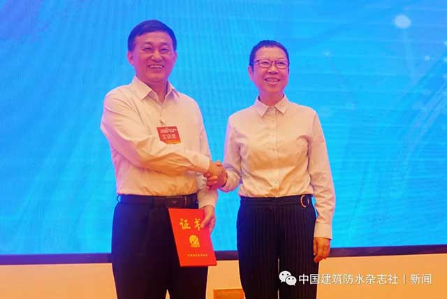 中國建筑防水協(xié)會(huì)常務(wù)駐會(huì)副會(huì)長(zhǎng)苗燕向胡希寶頒發(fā)瓦屋面分會(huì)副秘書長(zhǎng)證書。